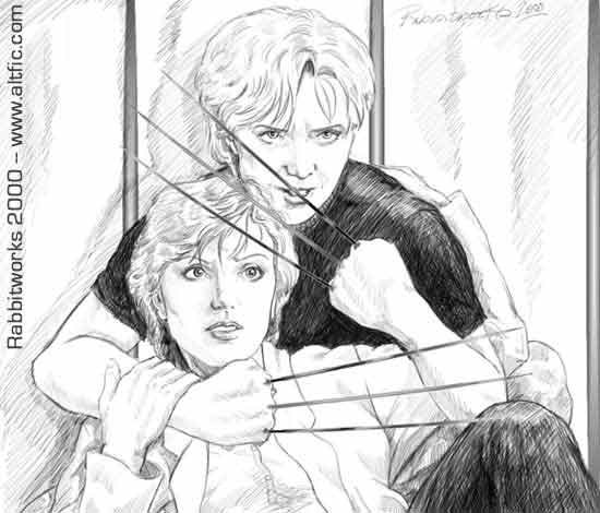 ...He stepped forward and Janet whimpered again, and oddly enough, the terrified sound served to focus Sam’s anger. All at once she found the claws springing out from her hands and, knowing what was happening, she managed not to impale herself again. She growled low in her throat and stepped forward, claws poised to strike. O’Neill just stood with a sneer on his face, his hands hanging loose at his side as if he were an old-fashioned gunfighter.... Art by Rabbitworks - May not be reproduced in any form (online or in print) without the express written permission of the author). This artwork is created strictly for the enjoyment of the artist and visitors to this site and may not be sold or traded in any fashion. Artwork © 2000 Pink Rabbit Productions