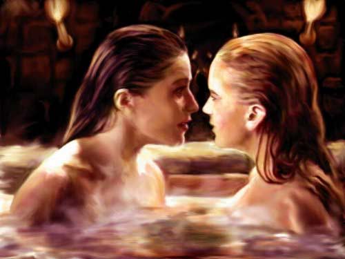 Steam Heat "What do you mean you lost it?" Xena demanded. "I didn't lose it," Gabrielle disagreed. "I had to hide it quickly. In case you haven't noticed, I didn't really have anyplace to hide it from the guards." "You managed to get my whip and chakram into prison that time." "Yes, by making them look like a hat, and a belt. Do you see anything that would need a belt to hold it up...and frankly, I think just a hat would look a little silly at the moment, don't you?" "You have a point," Xena allowed, then flashed a glance down the long hallway leading away from the king's personal bathing chambers. "And so do the swords belonging to King Polonius' personal guard...which are likely to be pointed at us in a few minutes." "Just this once, couldn't you have been a little less creative?" Gabrielle complained. "You know it gets my juices going," Xena responded, though for once, even she had the good graces to sound embarrassed by that fact. Gabrielle's expression twisted into a smirk. "Yeah, well, unless I miss my guess, that's what the king is hoping for...juices, I mean" Somewhere in the distance, the sound of creaking hinges, then booted feet marching on unforgiving stone, echoed through the halls. Gabrielle looked up, and chewed nervously on her lower lip. "That'd be the king." "And his men," Xena added. The marching was definitely drawing closer, leaving little doubt that Polonius meant it when he said he liked an audience. "Damn," the warrior exhaled. It had never occured to her that someone that unendowed by the Gods would want to brag about it. "So what are we gonna go?" Xena leaned forward, her nose a scant inch from her lover's. "Obviously, I'm going to have to get creative...again." She waited a beat, already reaching, her fingers brushing a smooth inner thigh. "So, where's the soap?" All images © 1996, 1997, 1998 Pink Rabbit