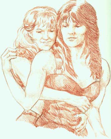 Colored pencil on fiber paper All artwork © 1996, 1997, 1998 Pink Rabbit Productions, and may not be reproduced without permission from the artist X:WP, and all characters are the property of MCA Universal Television, and Renaissance Pictures |