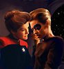 click on Illustration Icon to view ... and your blood runs colder Chapter 1: Down into the dark nothingness For I dipp'd into the future Within the immensity of space nothing holds sway on the universe except light and time. Matter changes; ever altering shape and mass. A planet in one time's frame, a cloud of dust in the next. Nothing is permanent and everything is changing. The vacuum draws together the molecules and a star bursts into existence, shines forth for unknown infinite ages, and fades away. The realm of time counts this life with a measure of seconds in the overall width and breadth of the universe. Infinitesimal, transient but with a set birth and death in time. However, it is fleeting for there are many stars and time stops for no one. The light gives life its foothold. Creatures are born into sentience, live out their lives and die all under the careful, masterless eye of time. Light nurtures and sustains them. Time guides them on the short trek from beginning to end. And the universe is unmarred by their passing. Time clicks over into the next frame and matter changes again. A new life here, an end there. The darkness of space exists only with the measure of time between the stars. Travellers move from the light of one place in the universe to the light of the next. They never pause long in the darkness. Darkness is the absence of the light which it consumes, absorbing all and giving none. Time seems to stand still within the darkness for it has no reference. No gravity to draw a planet around a star, and no star to live and churn and explode with light. They may not be within reach or even accessible in an allotted measure of time, but the stars are never beyond sight. Darkness holds only those who cannot create light or defy time's vastness. Trapped within the darkness there is no being, only matter without life. Moving forward through time and space, hurtling from the light into the dark, the tiny craft appeared. It was an artificial construct, created so those who dwelt within could bear the time and the darkness. It glowed with sustaining light and moved so fast as to propel its occupants from one star to another within their puny lifetimes. It moved with purpose and tirelessness, carried as much by the power of its engines as the minds of those within. Those minds held one thought: to return from whence they came. And even within the enormity of the universe and the grasp of unstoppable time, this was a long way indeed. The past, the future and the present all existed on the straight line between here and there. But the awareness of the clean passage of time, the neat and tidy movement of the first, next and last would soon seem muddled. Not so much for those on the ship as their voyage through time would be unaltered, but their perception of the value of time would be affected by the one they were about to meet. In a very short time, they would find the one without time. The one who held only a beginning, lost as it was to time, an ever changing present, and no end. And time can be cruel to those whose existence goes on farther than the eye can see and time can accurately measure. Captain's personal log, stardate 52411.2 The tract of space we are passing through is a vast empty wasteland without star systems or any sign of life whatsoever. It is like a relentless desert which must be crossed to get to the country beyond. I have never been disturbed by the infinite nature of the universe, but the void into which we now go leaves me faintly uneasy, as if in this nothingness all the eyes of the world are turned on us. Watching as we walk, step after step, across the unending barren. Captain Kathryn Janeway shivered involuntarily and turned her gaze to the faint stars moving in a blur beyond the windows of her quarters. There was nothing new out there only her reflection to give her any comfort. She touched the recorder control and continued. I'm not the only one who feels the emptiness. All the crew feel it to varying degrees but especially Seven of Nine. She fights the loneliness everyday of her new life, but being here, in this place, where there is no physical body to sustain life, she feels it even more acutely. I try to give her all the comfort I can, show her she is not alone, but, though she trusts me, she still finds it difficult to relate her insecurities. She does not want to show any weakness in front the crew, and me especially. I'm trying to help her understand the difference between weakness and normal human frailty but my own weakness, my oh so present frailty for her, often gets in the way. I need to ... The door chimed announcing the presence of someone who wished entrance. "Come in." Janeway ended the log recording and closed the program. Seven of Nine crossed the threshold and strode into the center of the room where she stood expectantly, hands behind her back. "Seven, you're early." Janeway furrowed her brows. "This is unusual for you." "I had nothing else with which I wished to occupy my time and I have observed that arriving for an appointment before the anticipated time is often welcomed." The ex-Borg watched as the Captain moved to the dining table and began arranging the setting. "This is very interesting as you usually schedule the hours in your day so efficiently." Janeway went to the replicator and called up the dishes she wished to serve for the night's meal. "You might have caught me in the shower." Seven's eyes narrowed as she considered this. "Captain, I would not infringe on your privacy by observing you nude." Janeway laughed as she placed the food on the table and poured two glasses of ice water. "Sit down please Seven." She sat across from her. "And as far as that goes, you already did." "That was under unusual circumstances," Seven said smoothing the napkin carefully in her lap as she had been taught. "I do not consider it to be the same thing." Janeway uncovered the platters and began spooning out the portions. "This is rice, yo